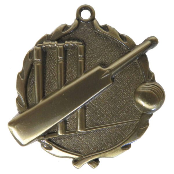 Gold cricket medal with cricket 3D image. Size: 45mm Diameter. Price includes ribbon. The back of the medal can be engraved. Please enter your engraving requirements in the details box.