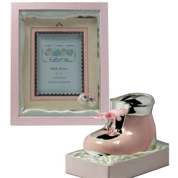 Baby Girl Gift Set which includes a Shoe Money Box plus a photo frame.
