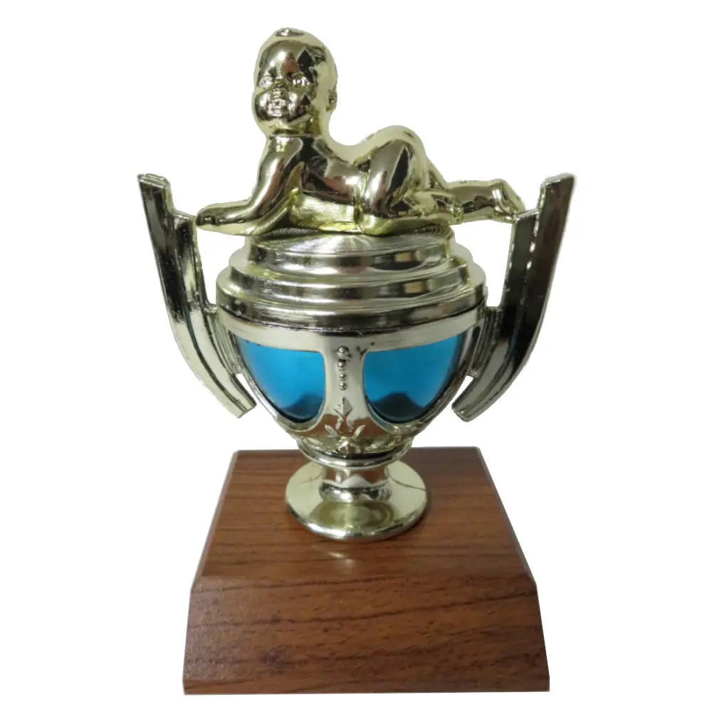 Cute Baby Trophy Cup with baby figurine atop a plastic trophy cup with turquoise & gold finish.