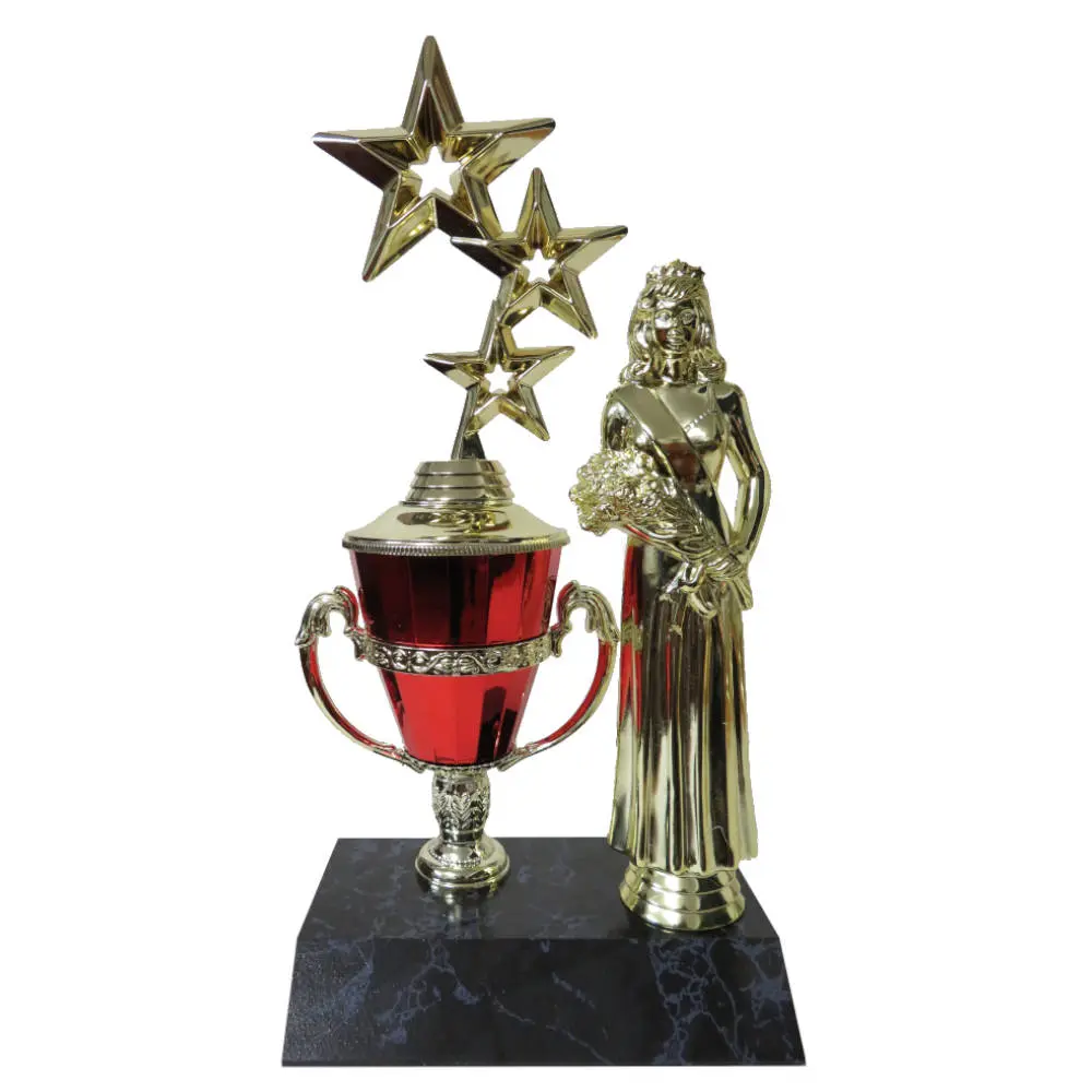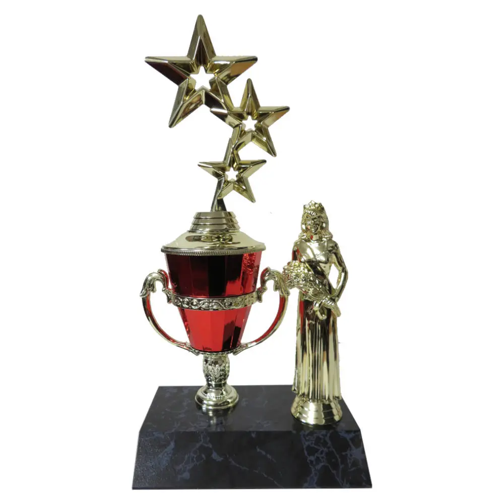 Beauty queen cup award with decorative red and gold cup topped with a triple star.