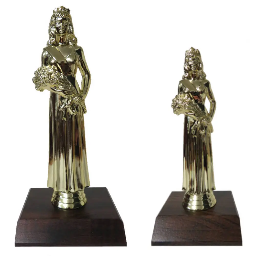 Beauty queen figures on a dark wood-grain base.
