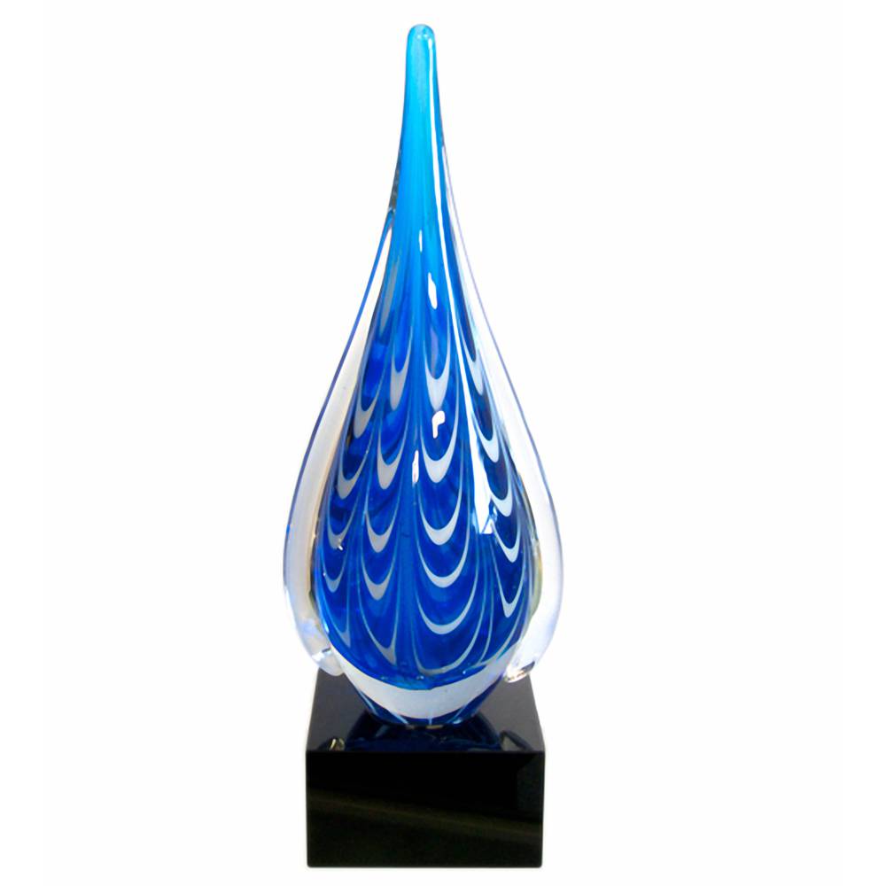 Handcrafted clear glass award with a blue and white scalloped centre and mounted on a black crystal base.