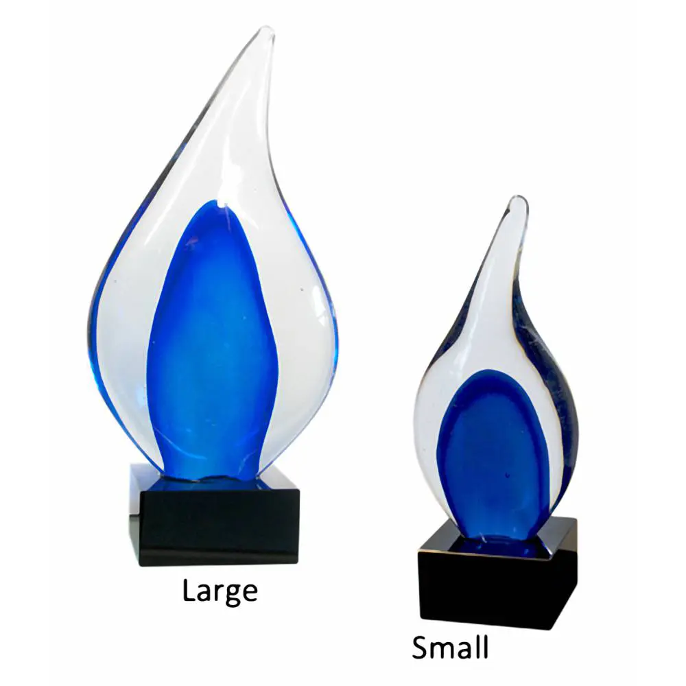 Beautiful handcrafted teardrop shape clear glass award with a shaded blue centre mounted on a black crystal base. Comes in a blue satin lined display box.