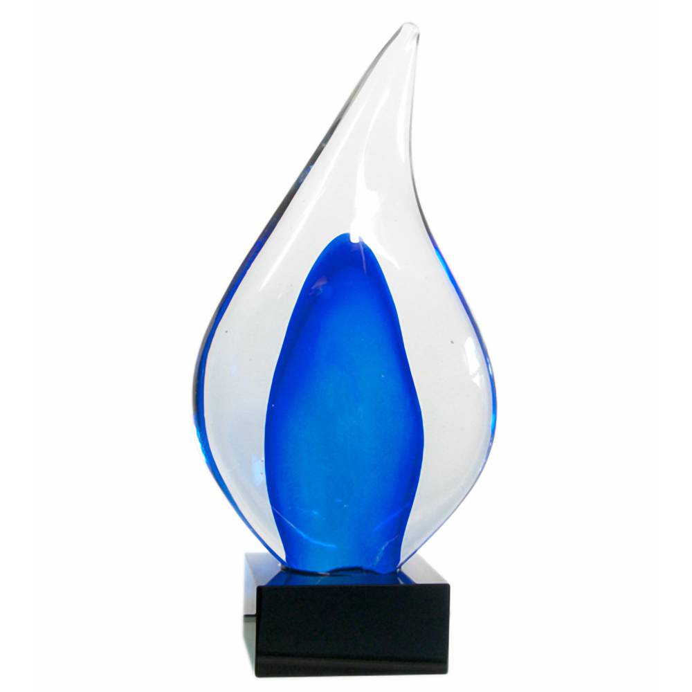 Beautiful handcrafted teardrop shape clear glass award with a shaded blue centre mounted on a black crystal base. Comes in a blue satin lined display box.