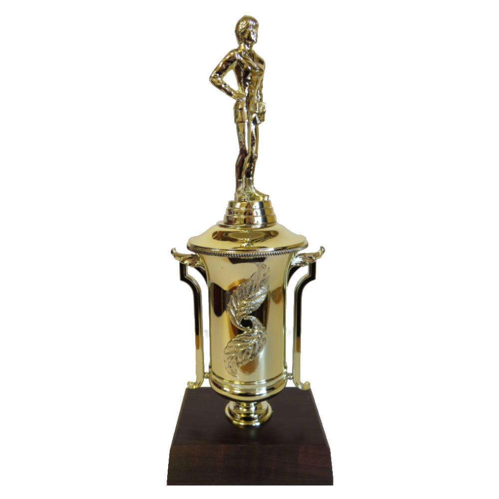 Coach Trophy Cup with a coach figurine on a gold plastic cup with embossed leaf pattern.