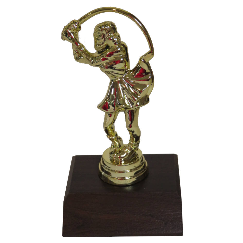 Comic Female Golfer Figurine on a dark woodgrain base.
