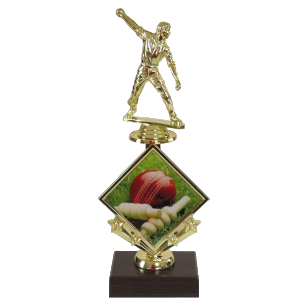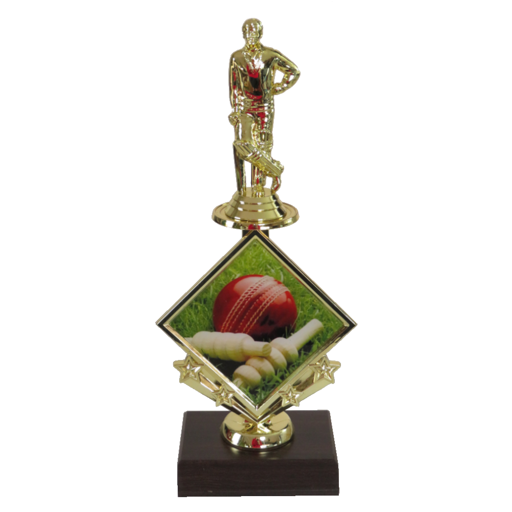 Cricket Star Insert Trophy with cricket image insert and cricket figurine.