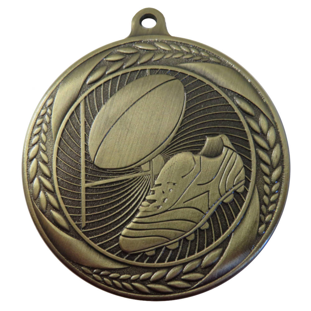 Antique gold Cyclone Rugby Medal with embossed rugby ball & boot and leaf wreath border.