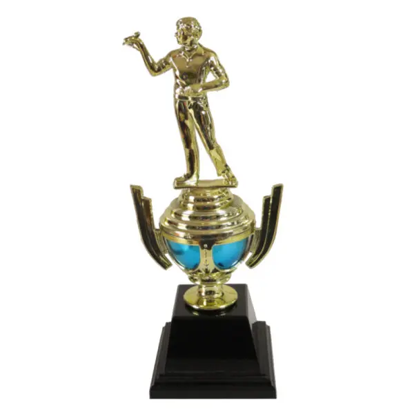 Darts Trophy Cup with darts figurine on gold & turquoise plastic cup