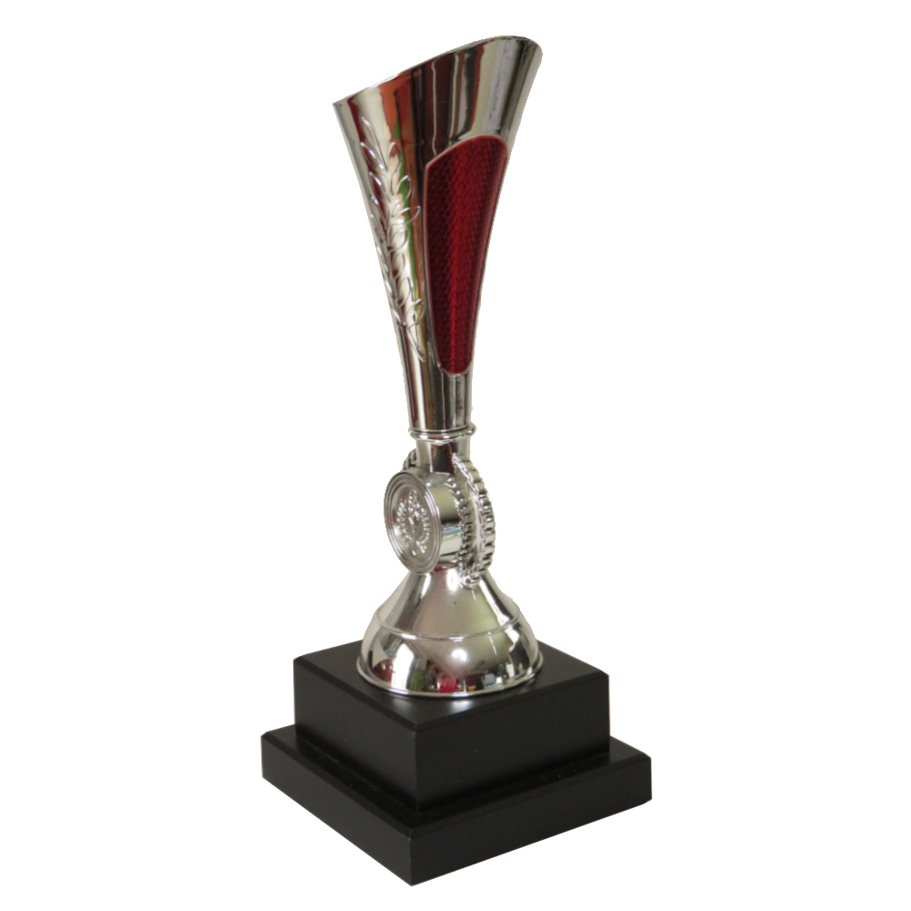 Lovely modern style Dundee Cup award with embossed leaf pattern on silver and red cup.