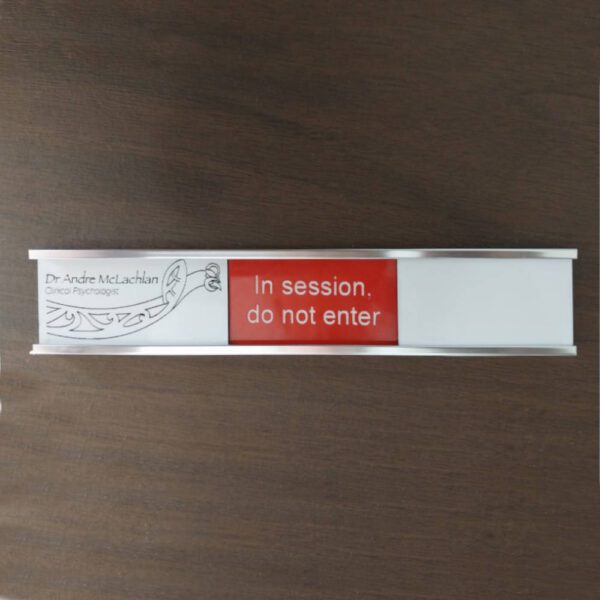 Engraved Sliding Sign with grooved holder. Dimensions: 25mm high x 150mm long