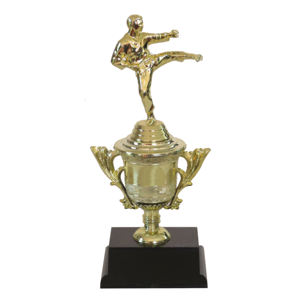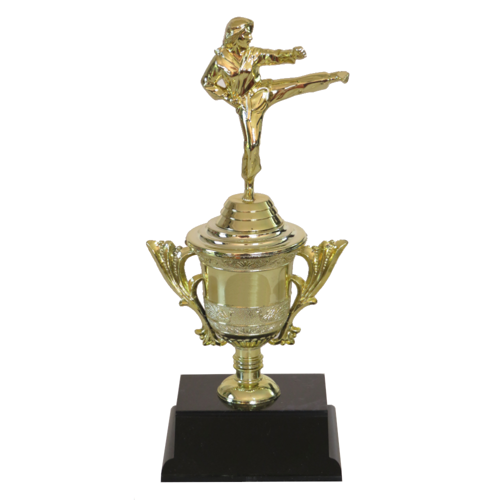 Fancy Miniature Karate Cup with a karate figurine on a decorative gold cup.