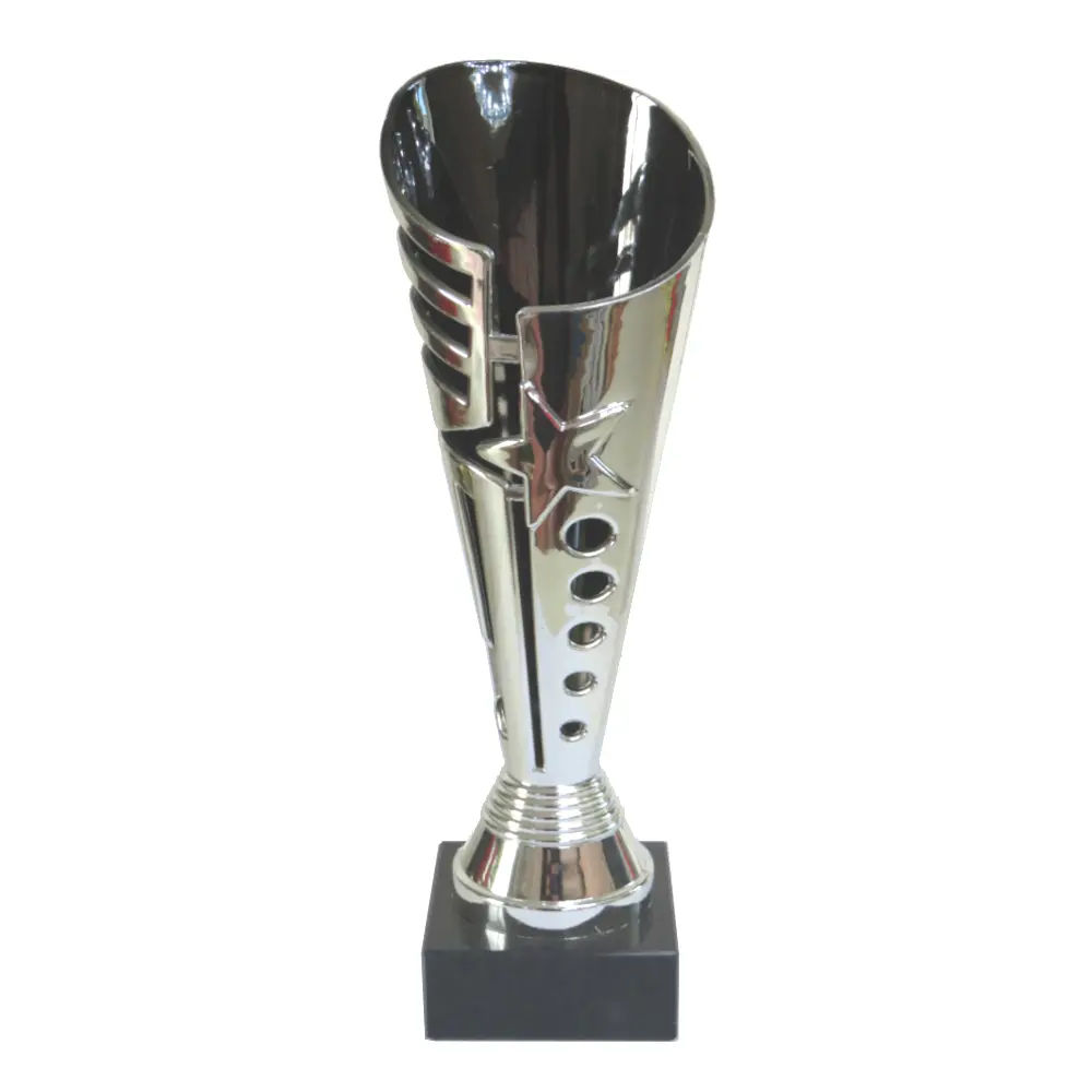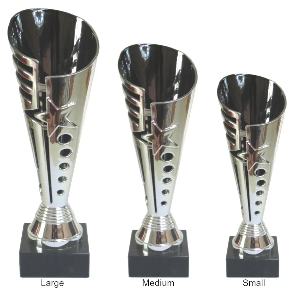 Stylish trophy with fluted plastic cup and decorative star & cut out shapes.