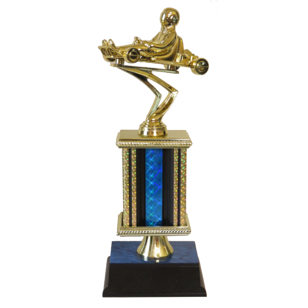 Stylish Trophy with Go Kart figurine on top of a sparkling blue & gold column.
