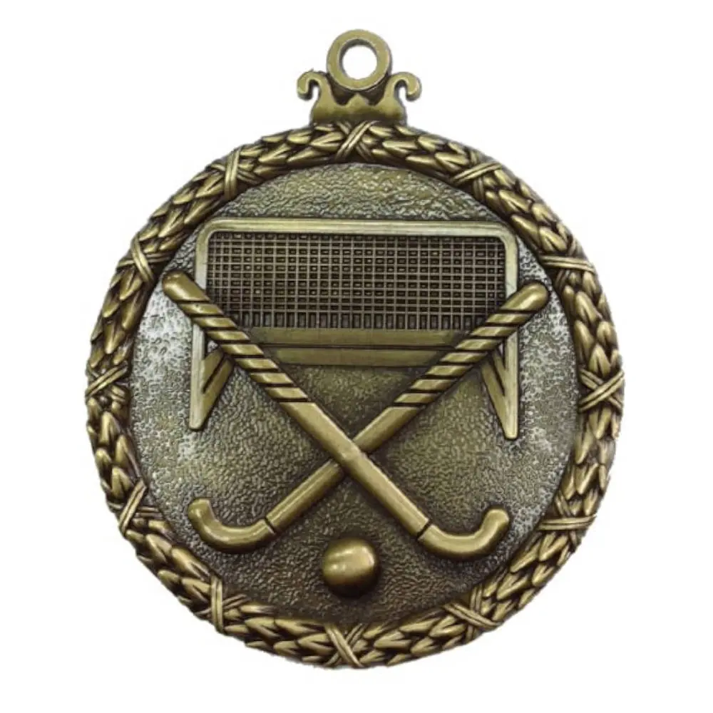 Antique style Gold Wreath Hockey Medal with hi-relief hockey image.