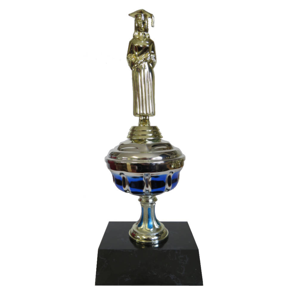 Graduation Trophy Cup with graduation figurine atop a silver and blue bowl cup.