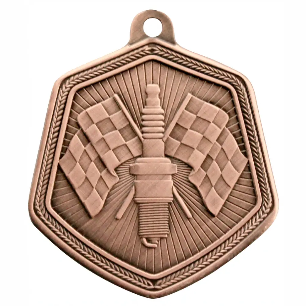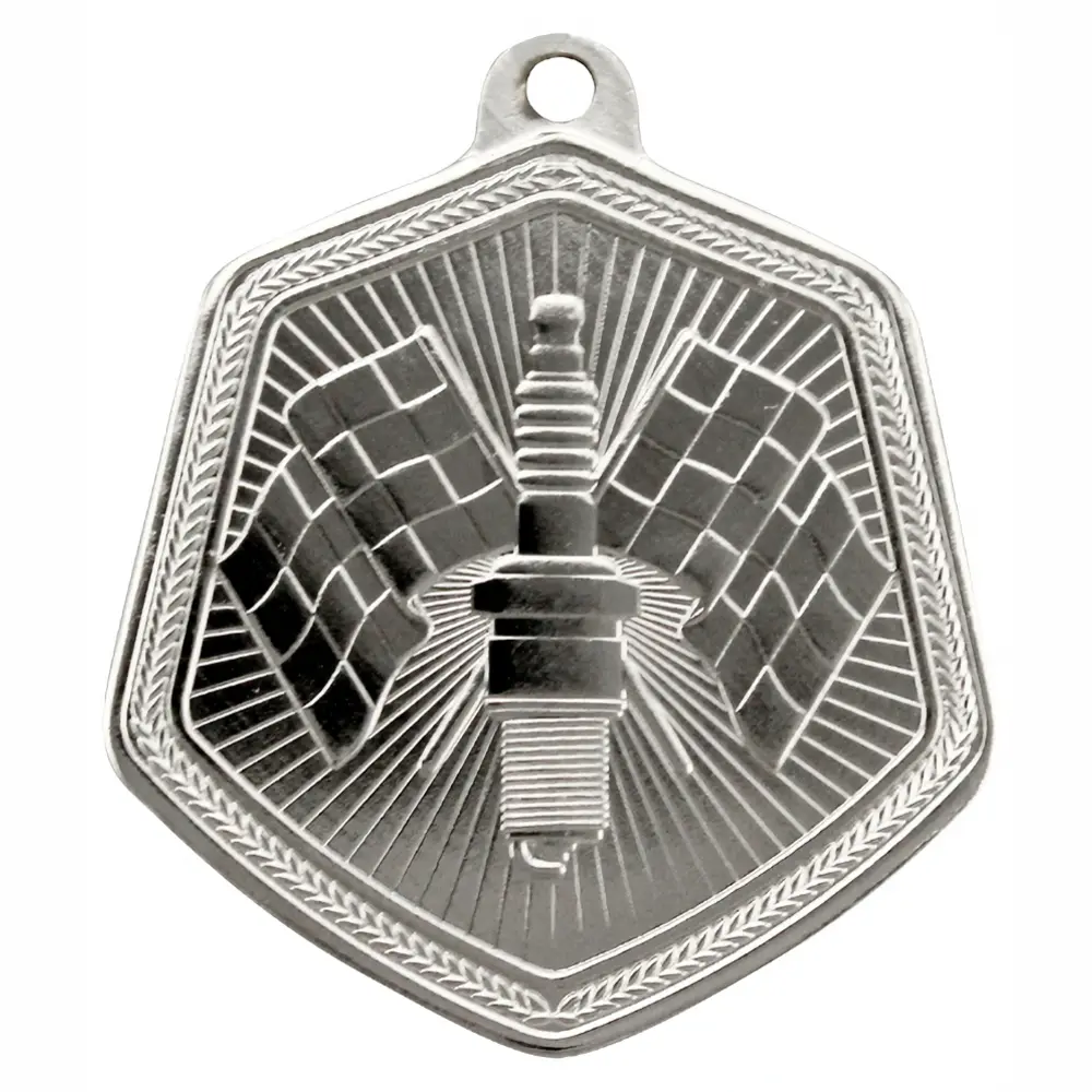 Hexagon Motorsport Medal with embossed motorsport themed image.