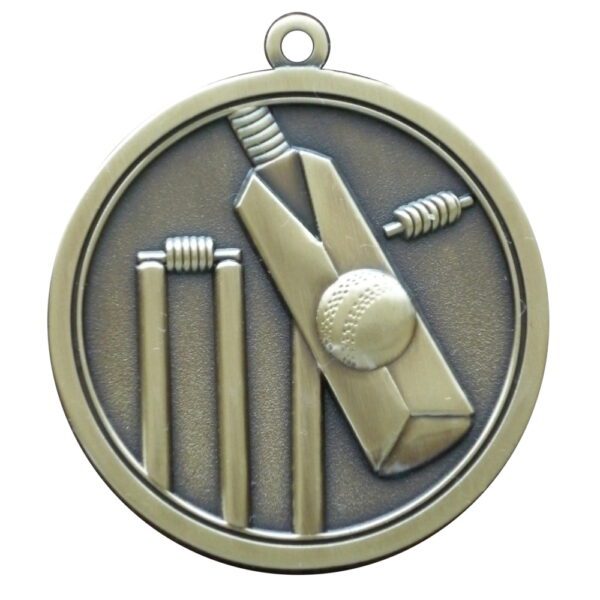 Hi relief gold medal with cricket relief image. Size: 45mm Diameter. Price includes ribbon. The back of the medal is engraveable. Please enter your engraving requirements in the details box.