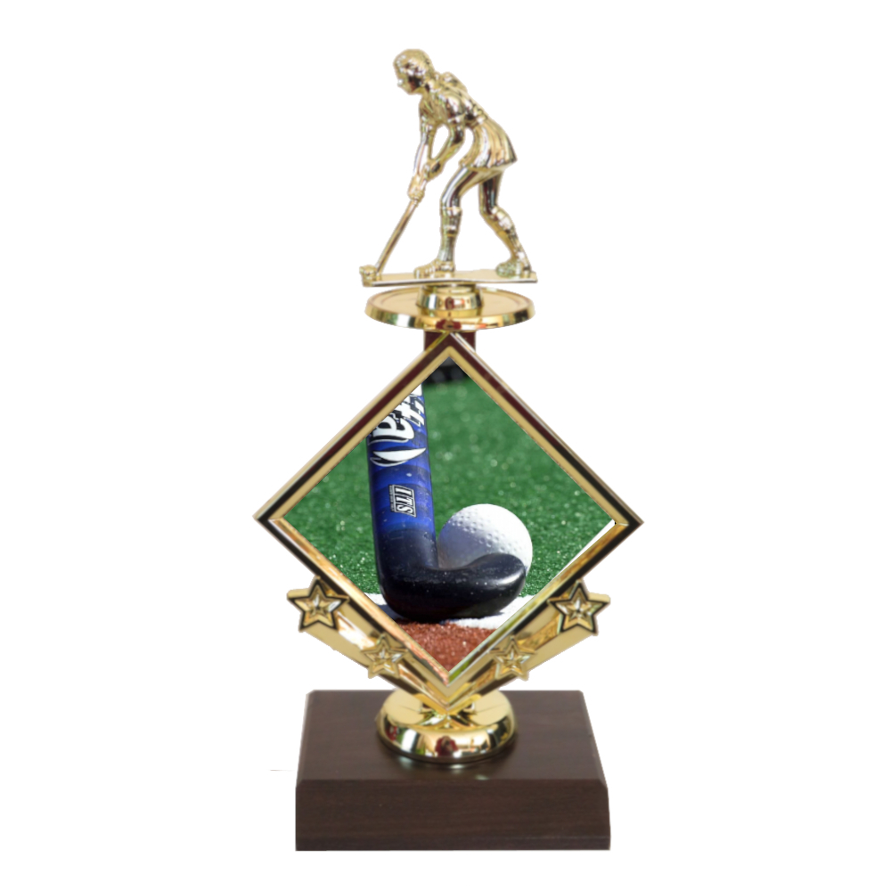 Star studded diamond shaped trophy with hockey figurine and hockey image insert.