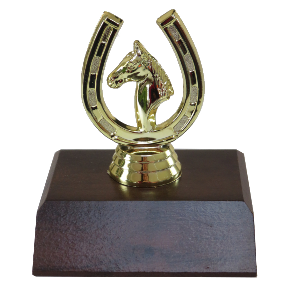 Gold Horseshoe Figure on a dark woodgrain base.