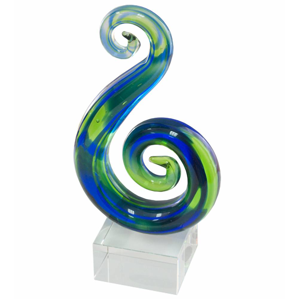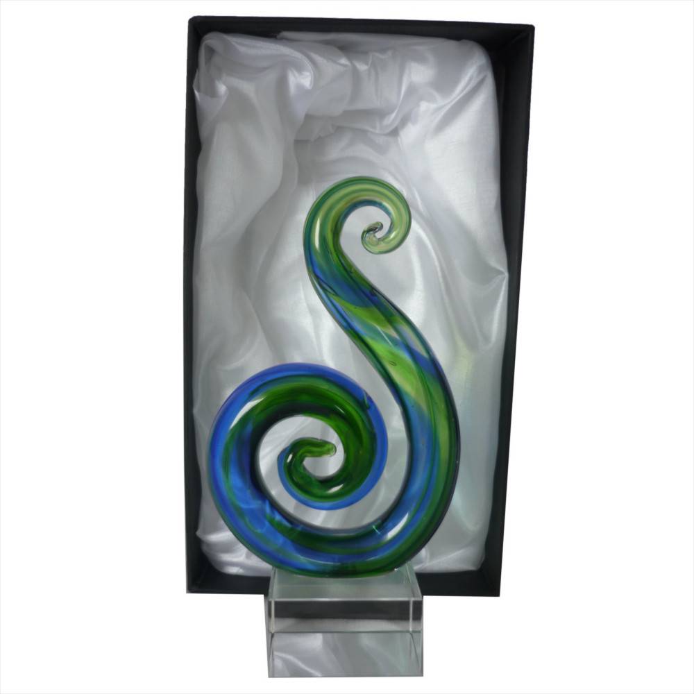 Beautiful hand-crafted green and blue glass Koru Double Spiral Award.