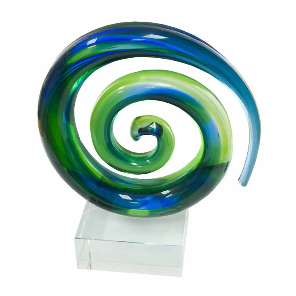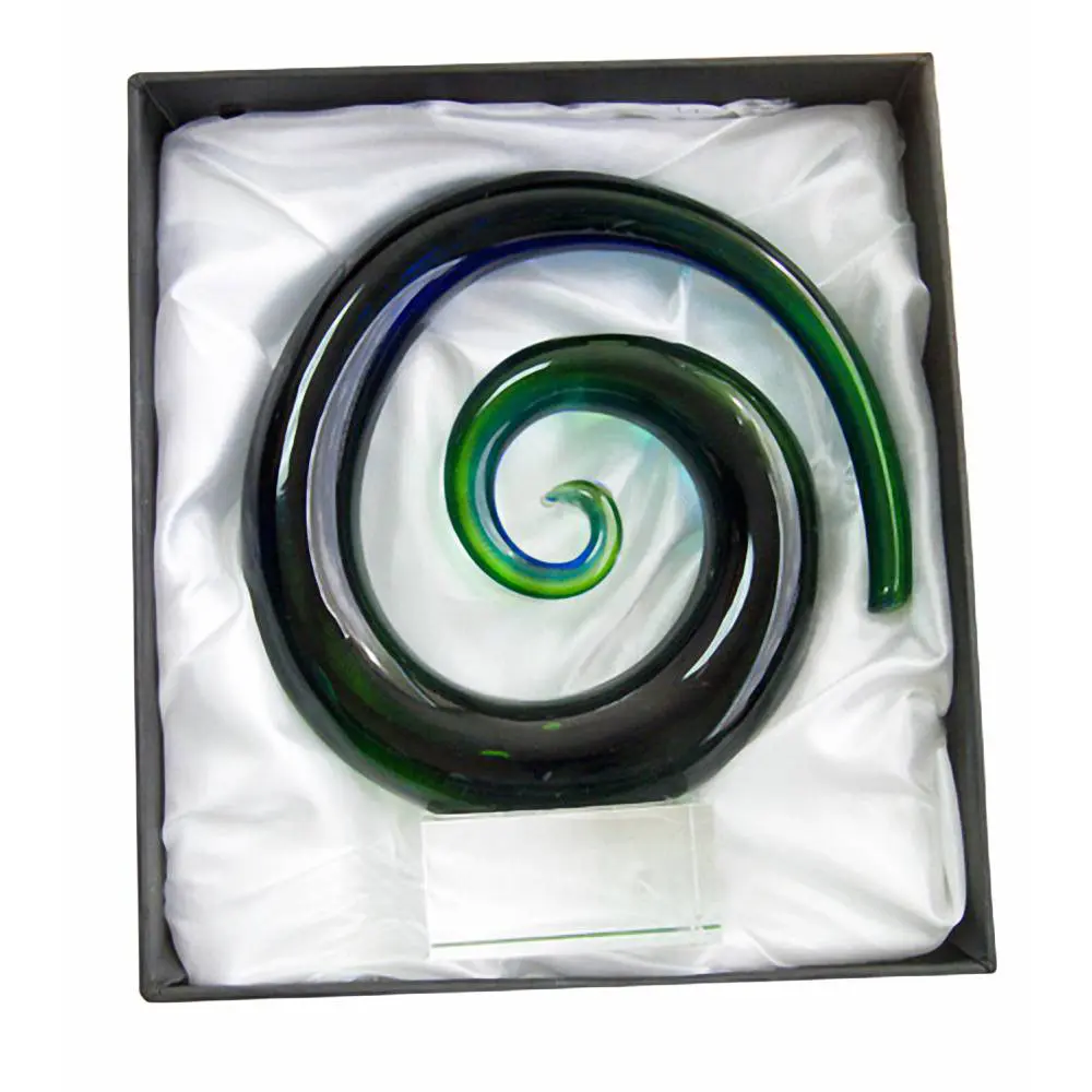 Beautiful hand-crafted green and blue koru spiral crystal award.