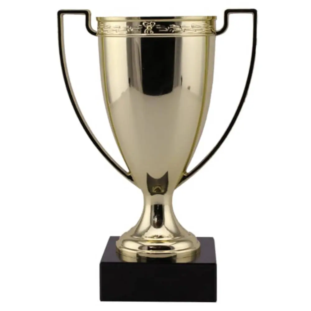 Stylish gold plastic cup with decorative pattern rim. Black marble base.