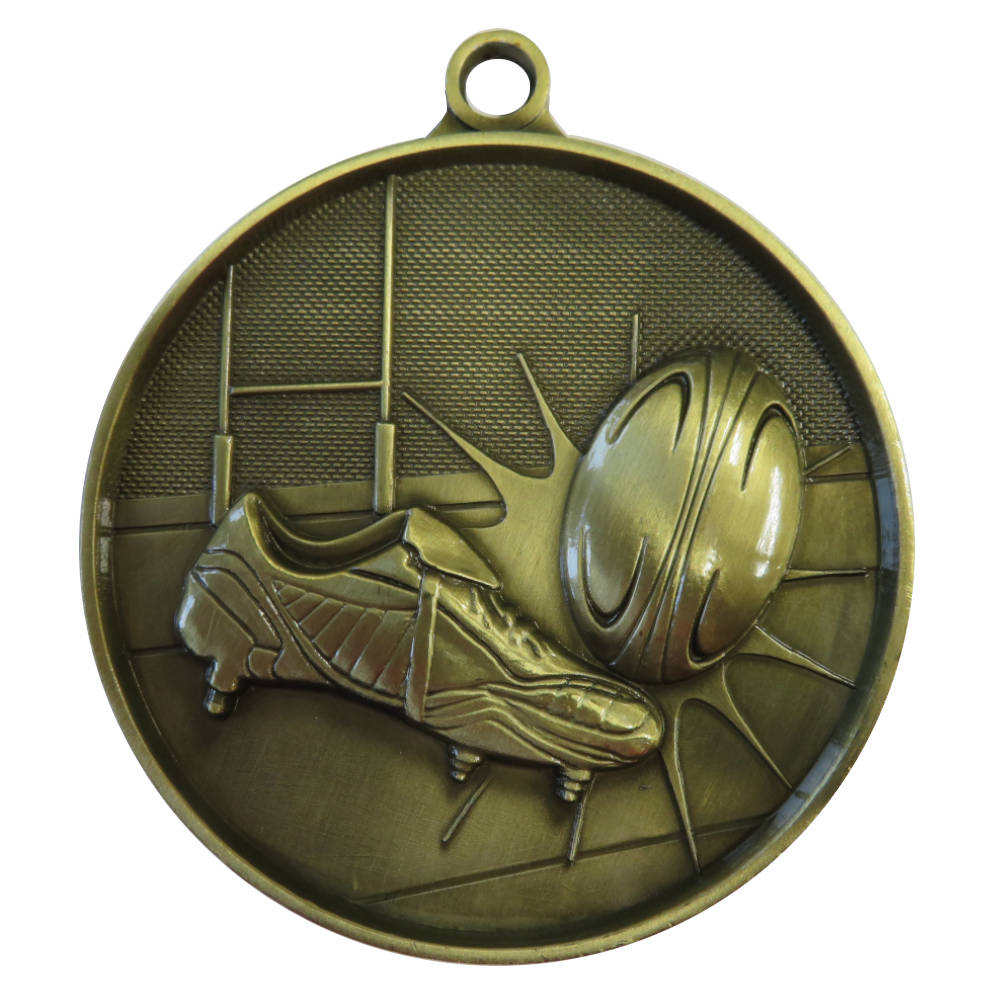 Antique gold Large Rugby Medal with 3D rugby ball and boot.