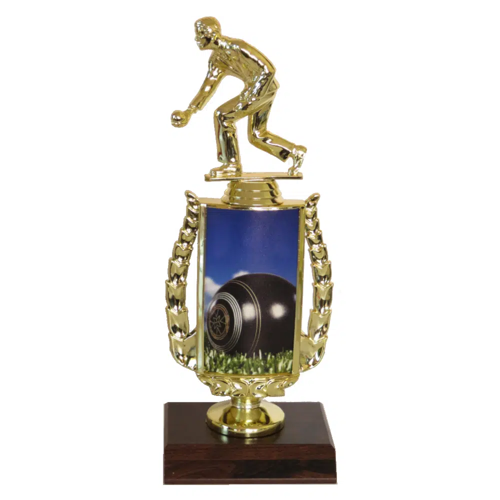 Lawn Bowls Insert Trophy with lawn bowls figurine and coloured image insert.