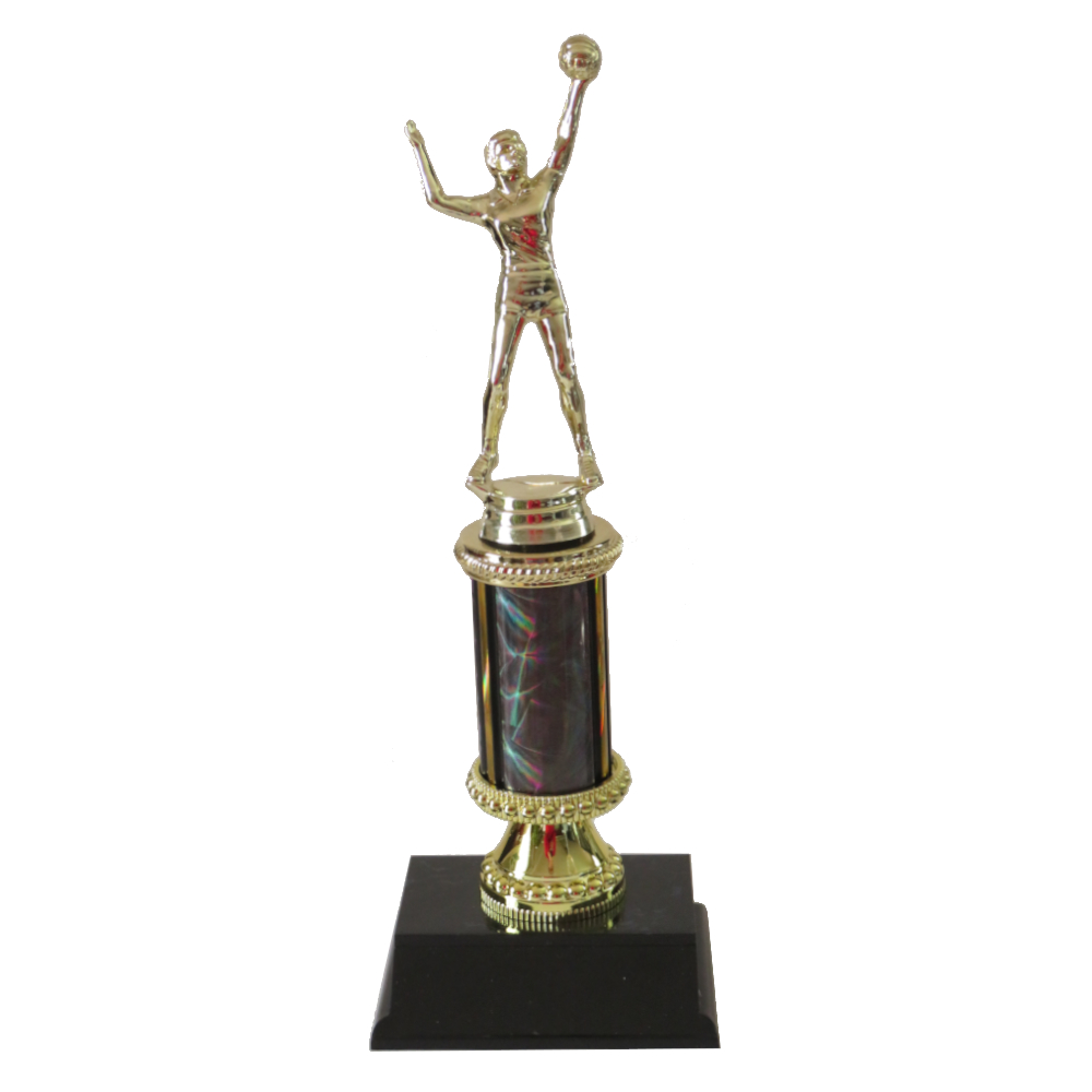 Volleyball Trophy with male volleyballer figurine on a black and silver column.