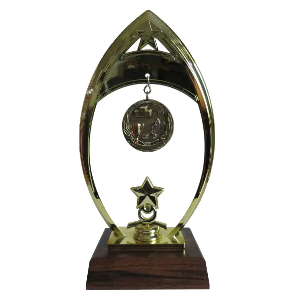 Medal Holder Display Stand with gold archway and star trim on a dark woodgrain base.