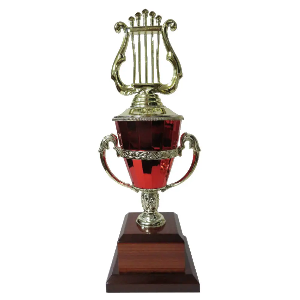 Music Lyre Trophy Cup with music lyre figurine on a decorative red and gold cup.