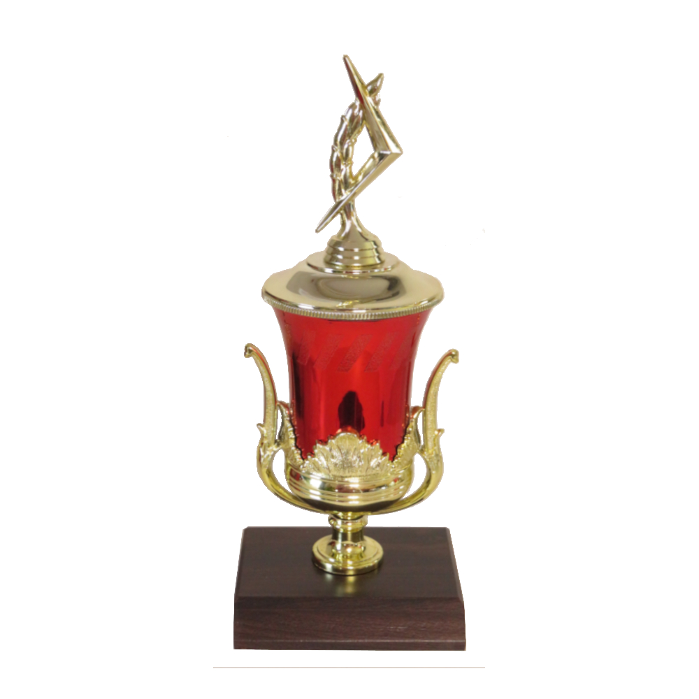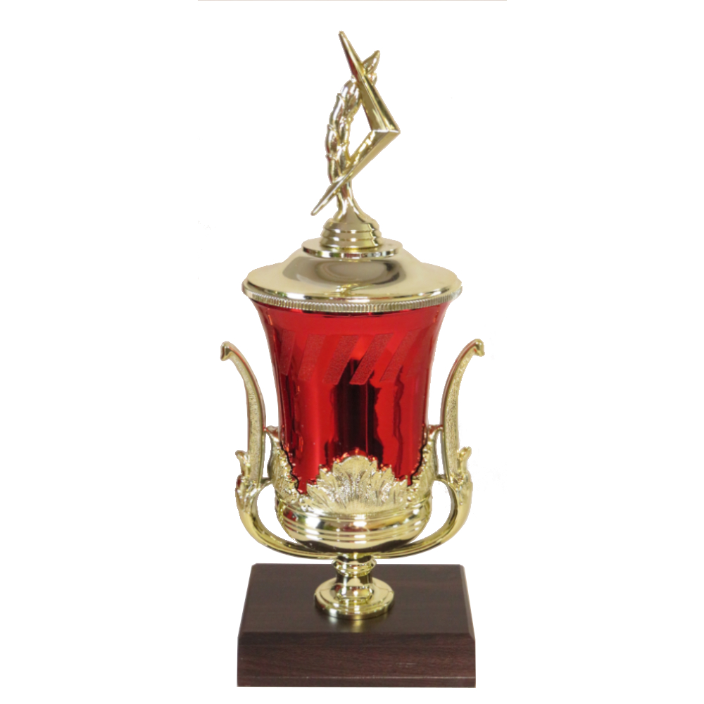 Exquisite plastic cup with red finish and gold decals.