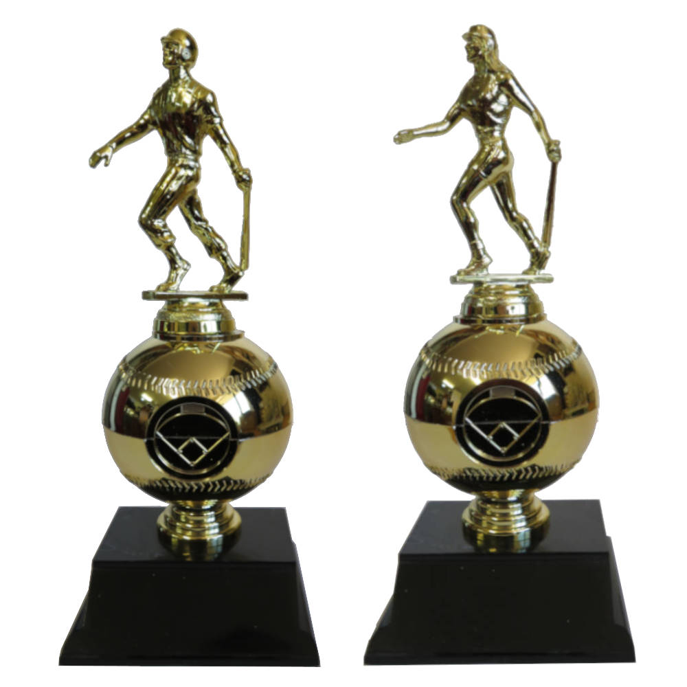 Softball Runner Trophy with softball runner figurine atop a large gold softball.