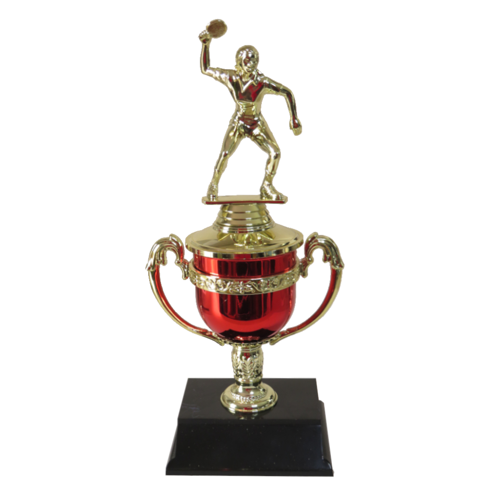 Stylish trophy cup with a table tennis figurine on a red & gold plastic cup.