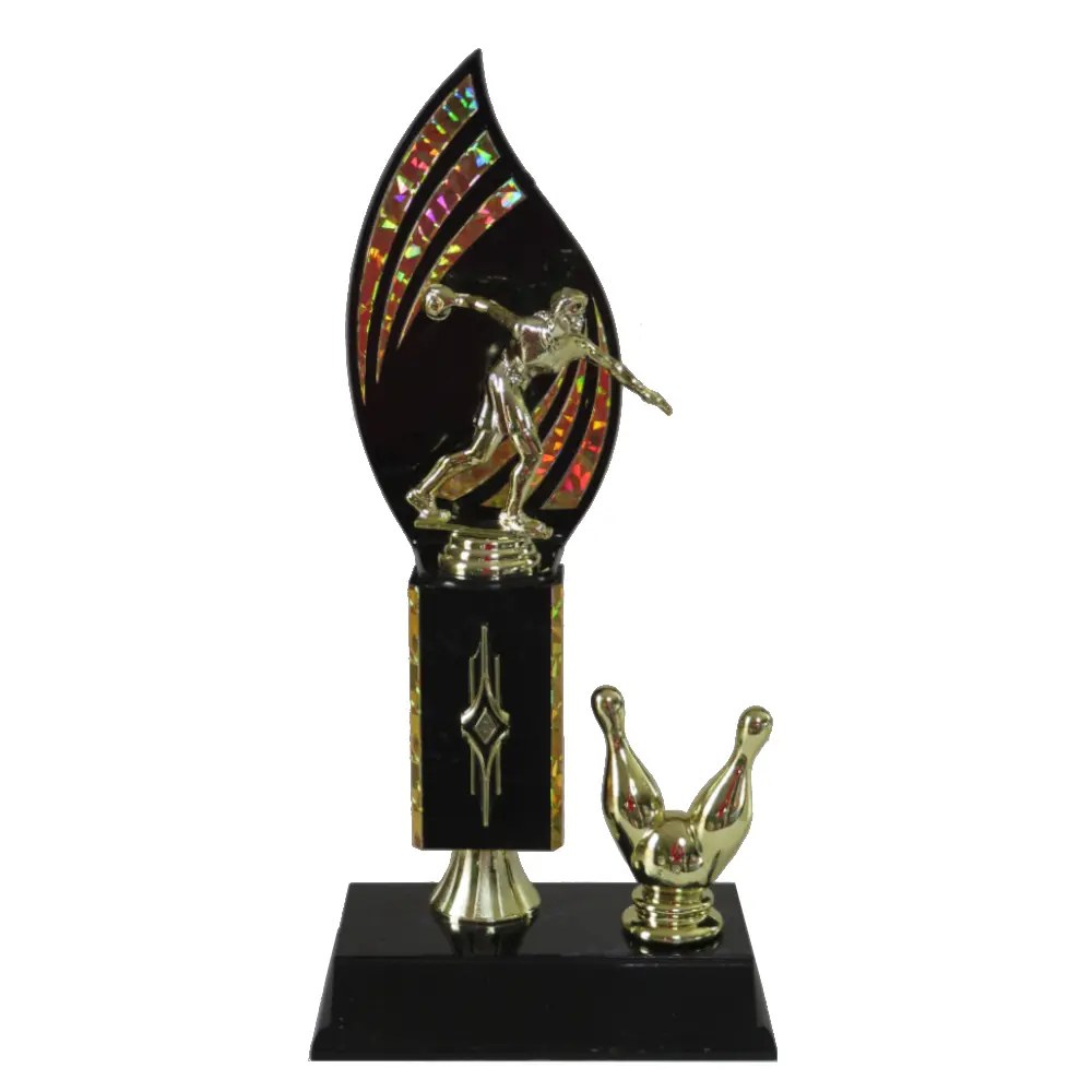 Ten Pin Bowling trophy with gold flame backdrop and diamond bar trim.