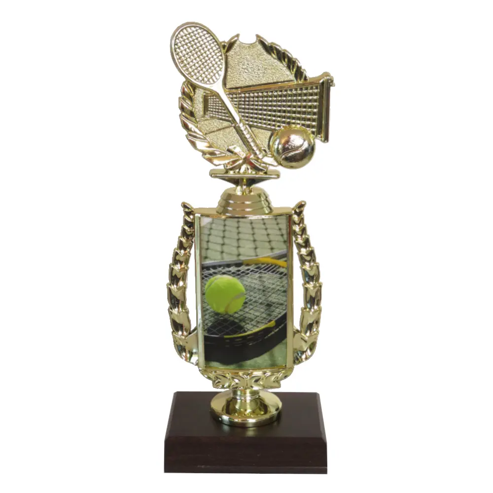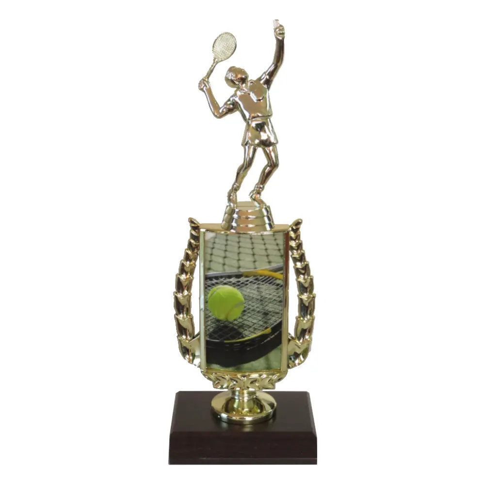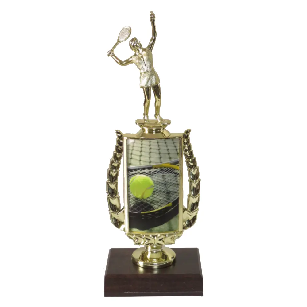 Tennis Sports Insert Trophy with tennis figurine and tennis image insert.