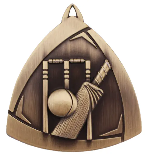 Triangular Medal with cricket image featuring a cricket ball, bat and wickets in 3D design.