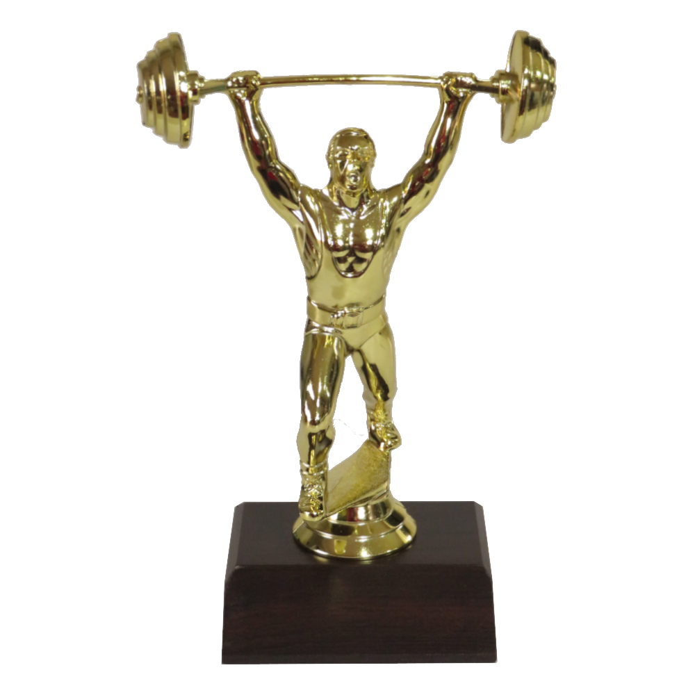 Weightlifter figurine on a dark wood grain base.
