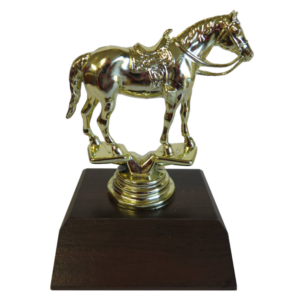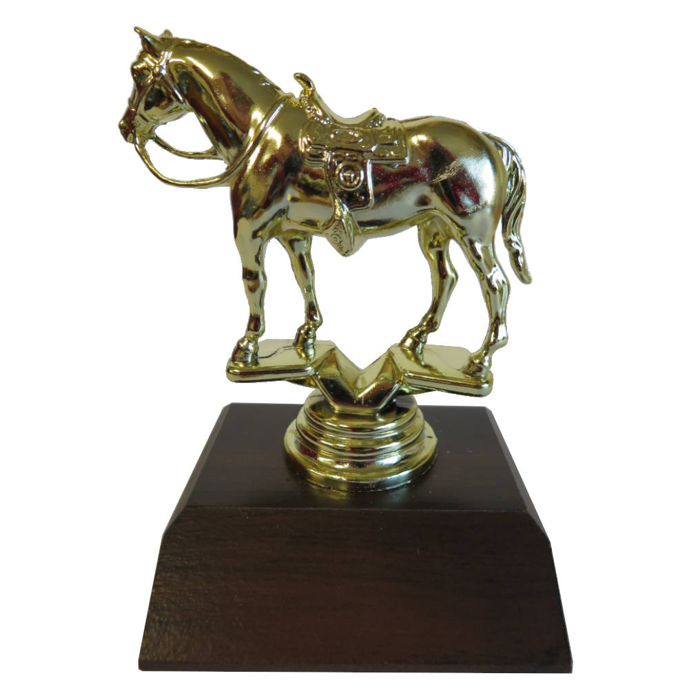 Western horse figurine on a dark wood-grain base.