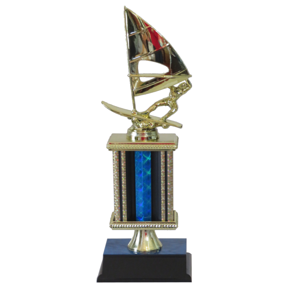Windsurfer trophy with windsurfer figurine on sparkling blue & gold column.