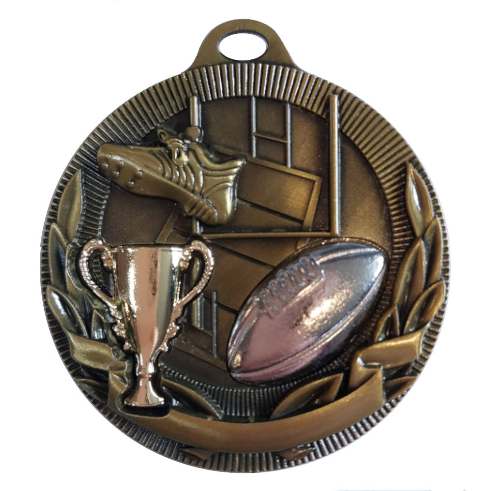 Antique style gold medal with rugby image featuring a gold cup and silver rugby ball.